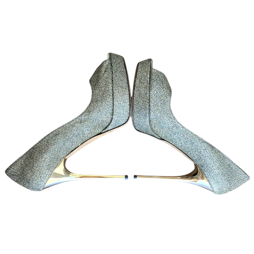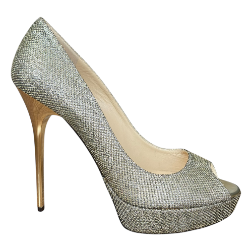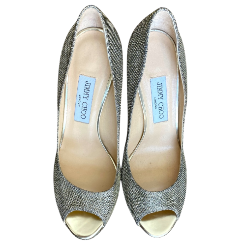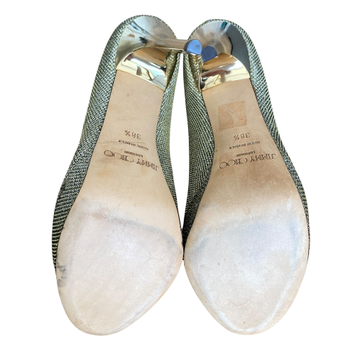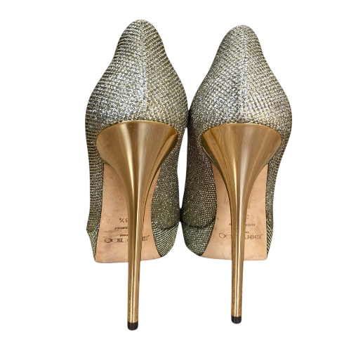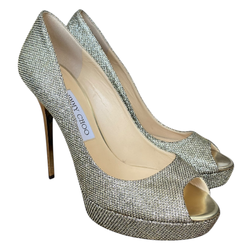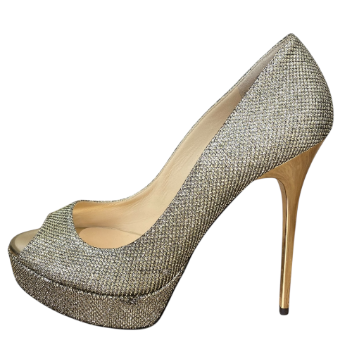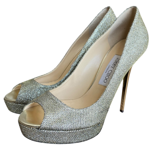 JIMMY CHOO Dahlia Gold/Silver Glitter Fabric Platform Pumps Size 38.5