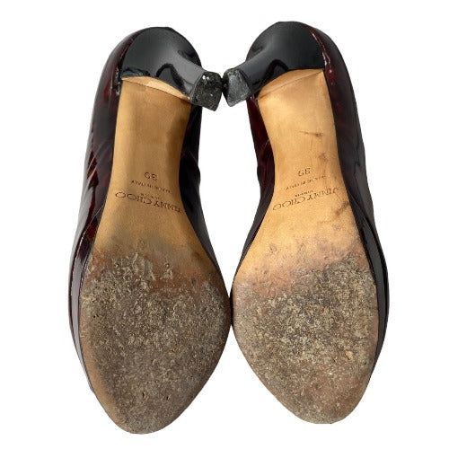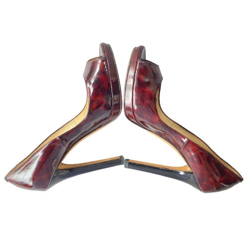 JIMMY CHOO Luna Tortoise Shell Burgundy Patent Leather Peep Toe Pumps, Size 39