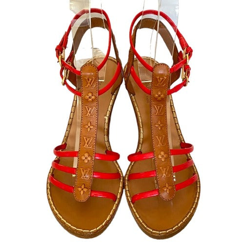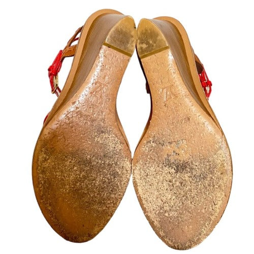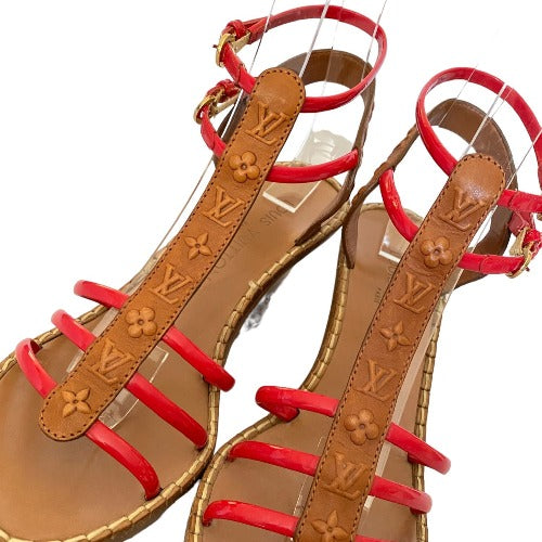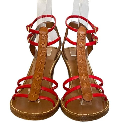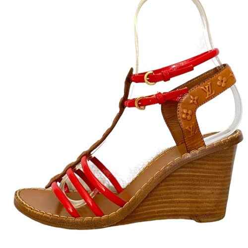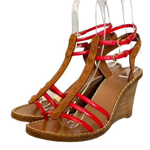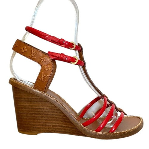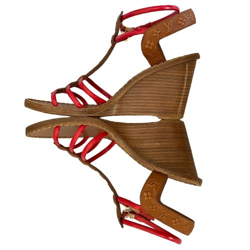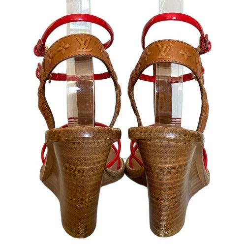 LOUIS VUITTON Brown Monogram Embossed Leather, Red Patent Strappy Wedges Size 37