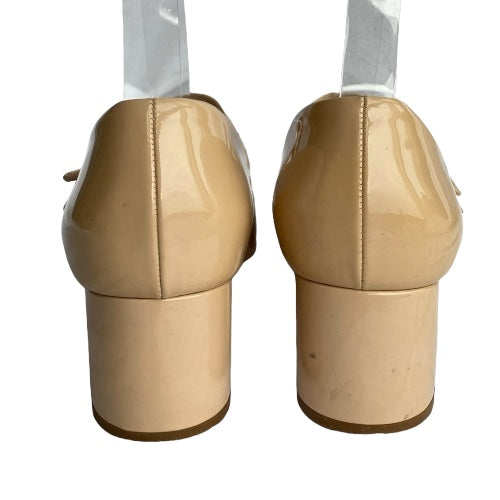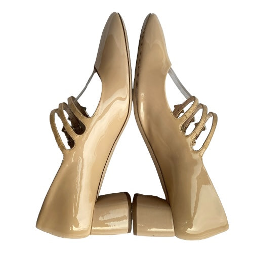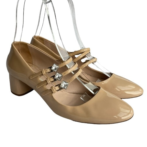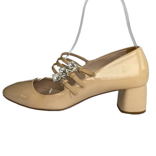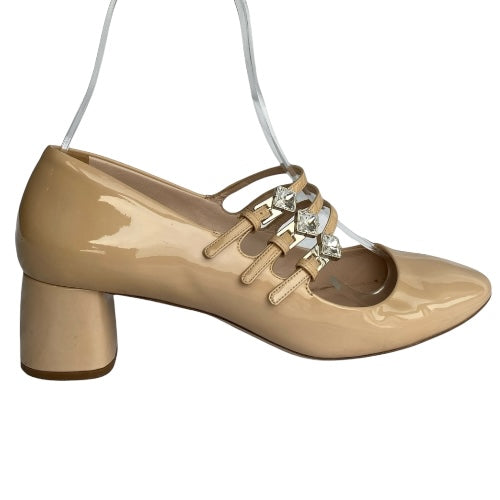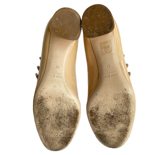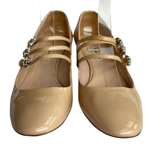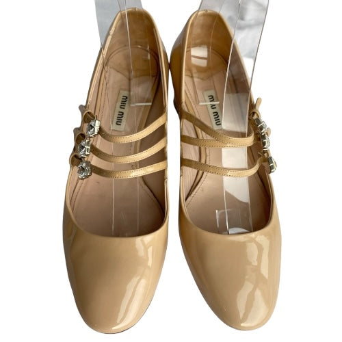MIU MIU Beige Patent Leather Crystal Strap Mary Jane Low Heel Pumps, Size 38