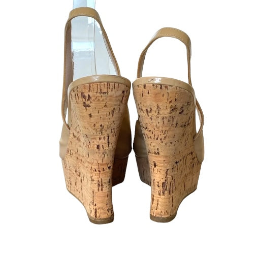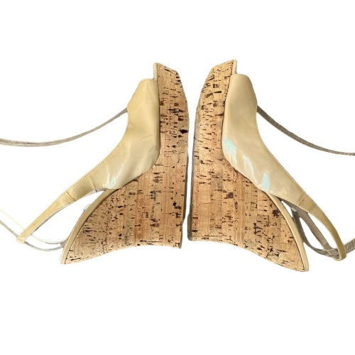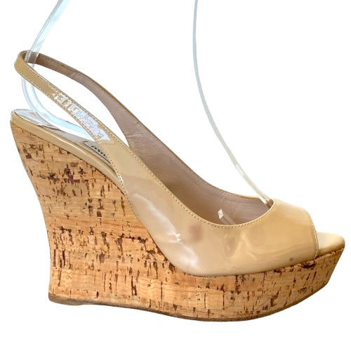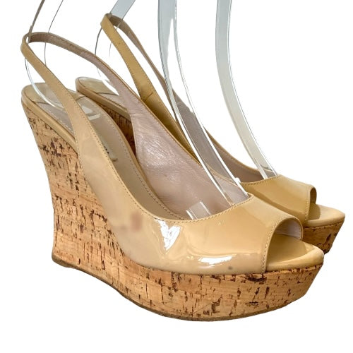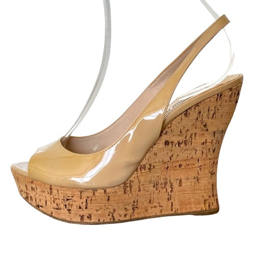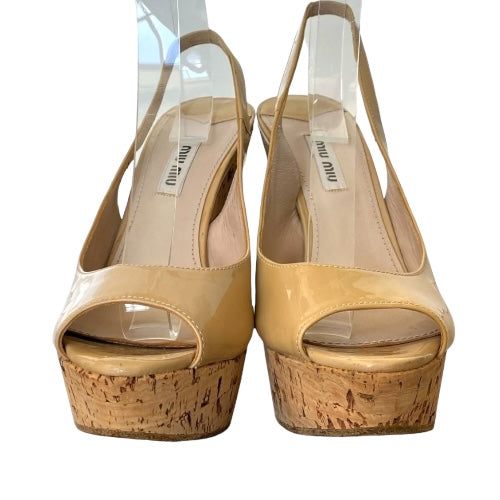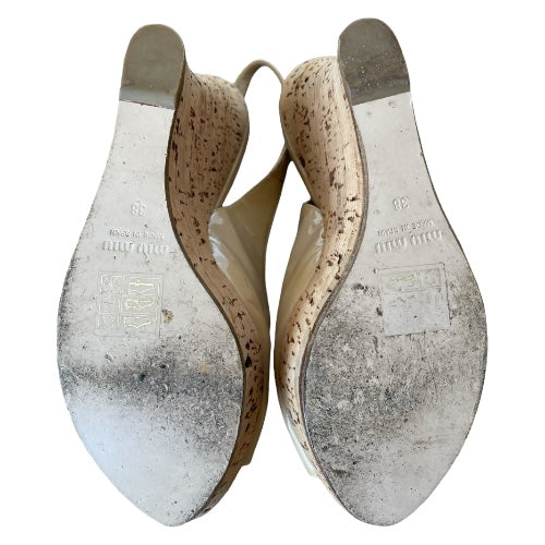 MIU MIU Beige Patent Leather Peep Toe Slingback Cork Wedge Sandals, Size 38