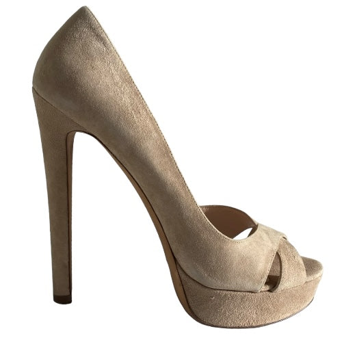 MIU MIU Beige Suede Crisscross Straps Peep Toe Half D'orsay Platform Pumps, 39