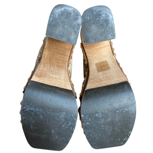 MIU MIU Beige Suede Studded Slingback Wooden Heeled Sandals, Size 38.5