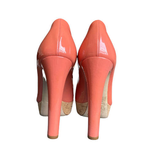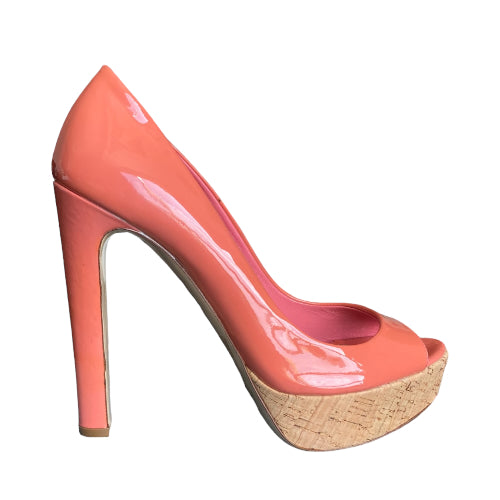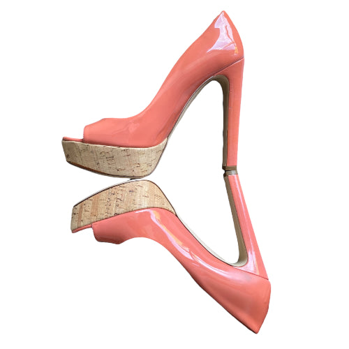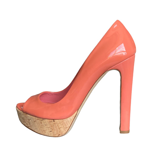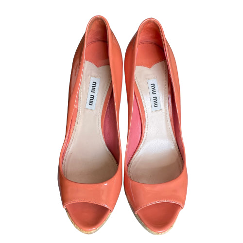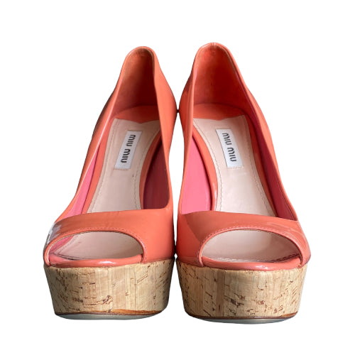 MIU MIU Coral Patent Leather Cork Platform Peep Toe Pumps, Size 37.5