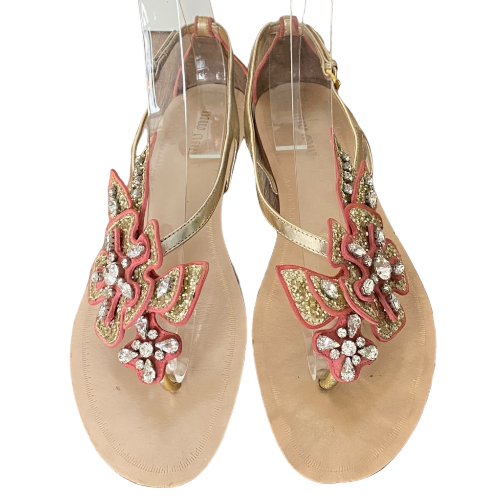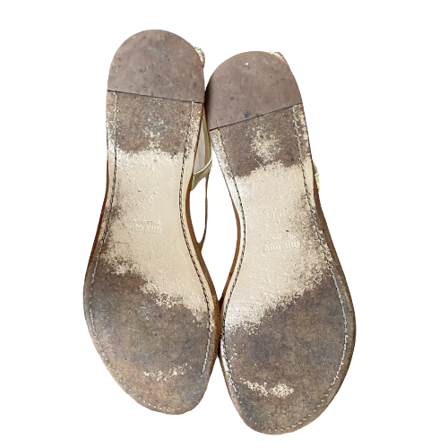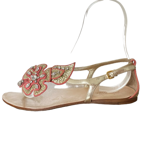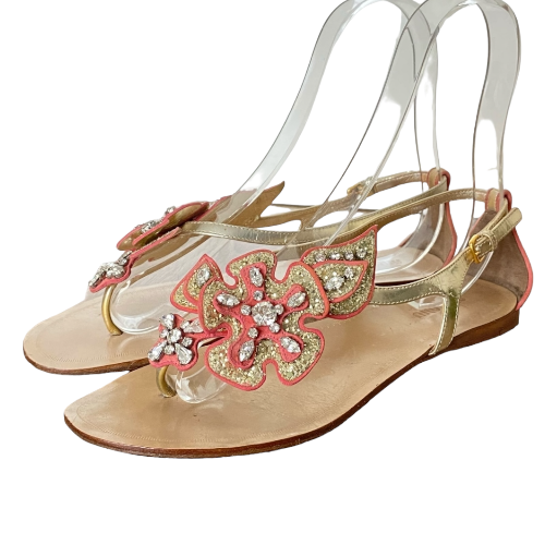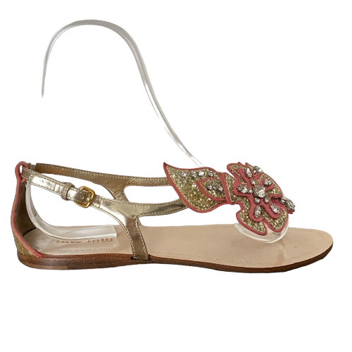 MIU MIU Gold Glitter Coral Pink Crystal Leather Flower Flat Sandals, Size 37