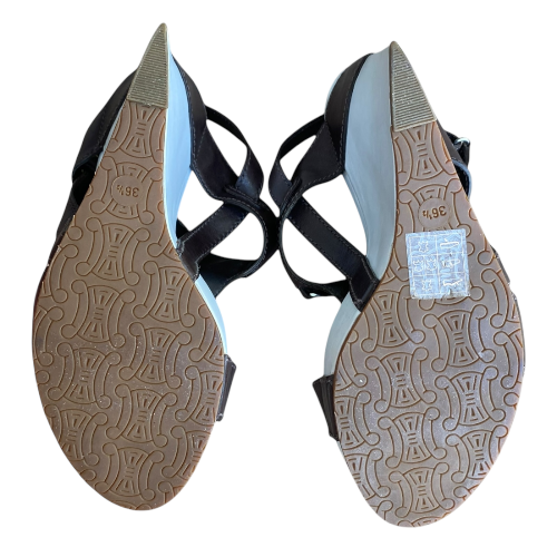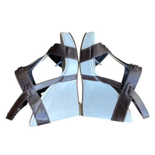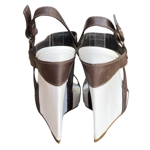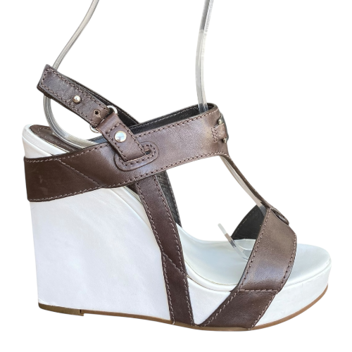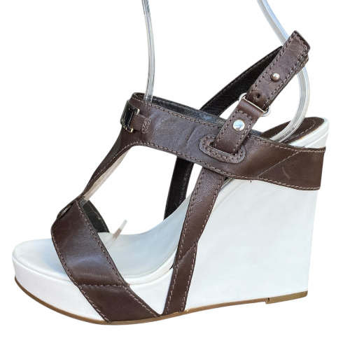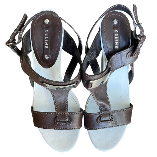 NEW CELINE Brown Leather T Strap White Leather Wedge Heel Sandals, Size 36.5