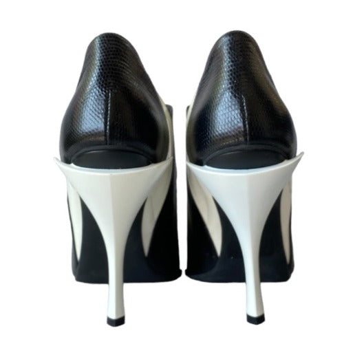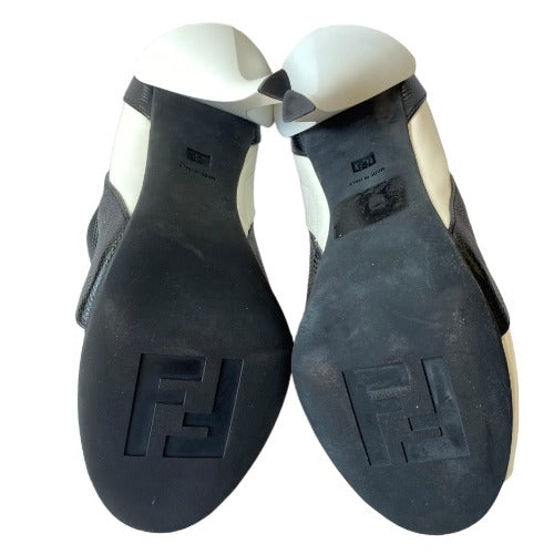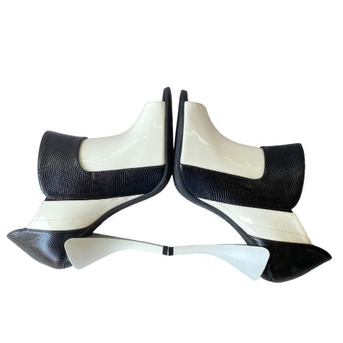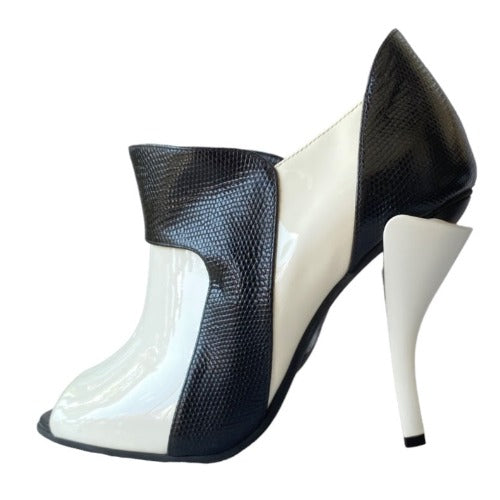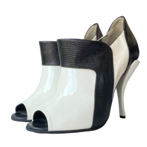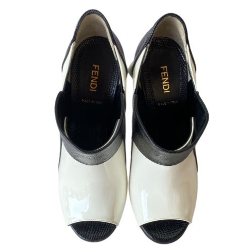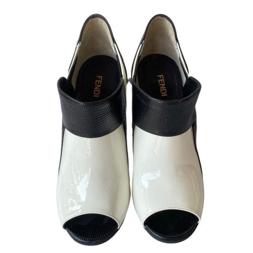 NEW FENDI White Patent Leather, Black Lizard Embossed Peep Toe Bootie, Size 38