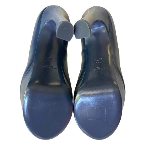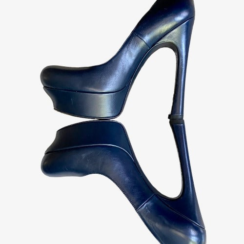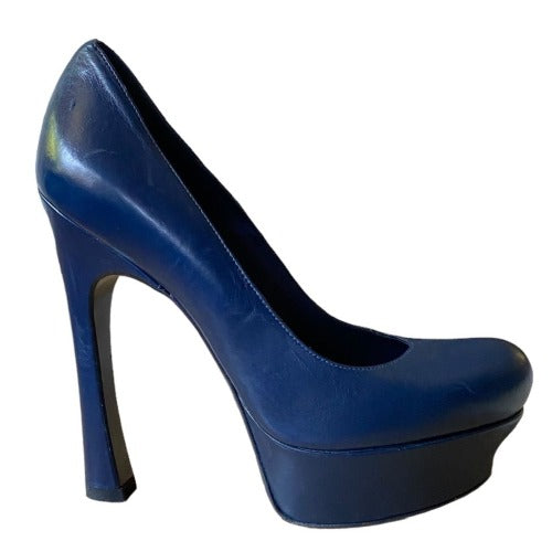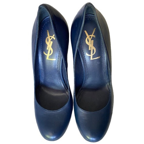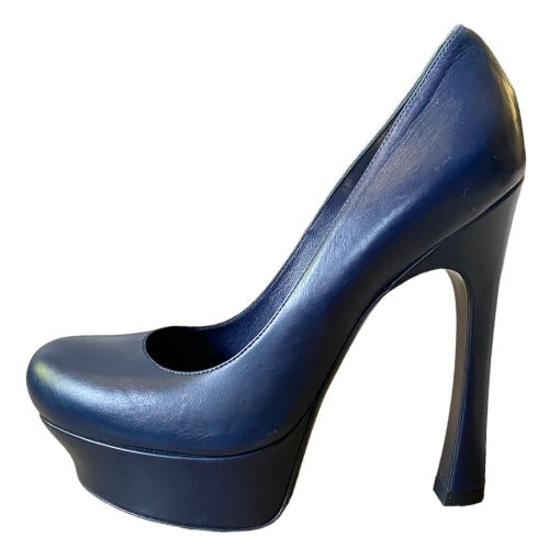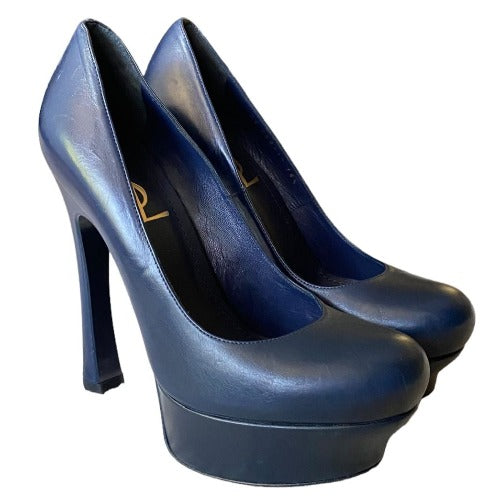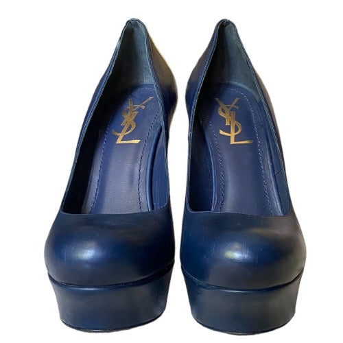 NEW YVES SAINT LAURENT Navy Leather Round Toe Tribute Platform Pumps, Size 36.5