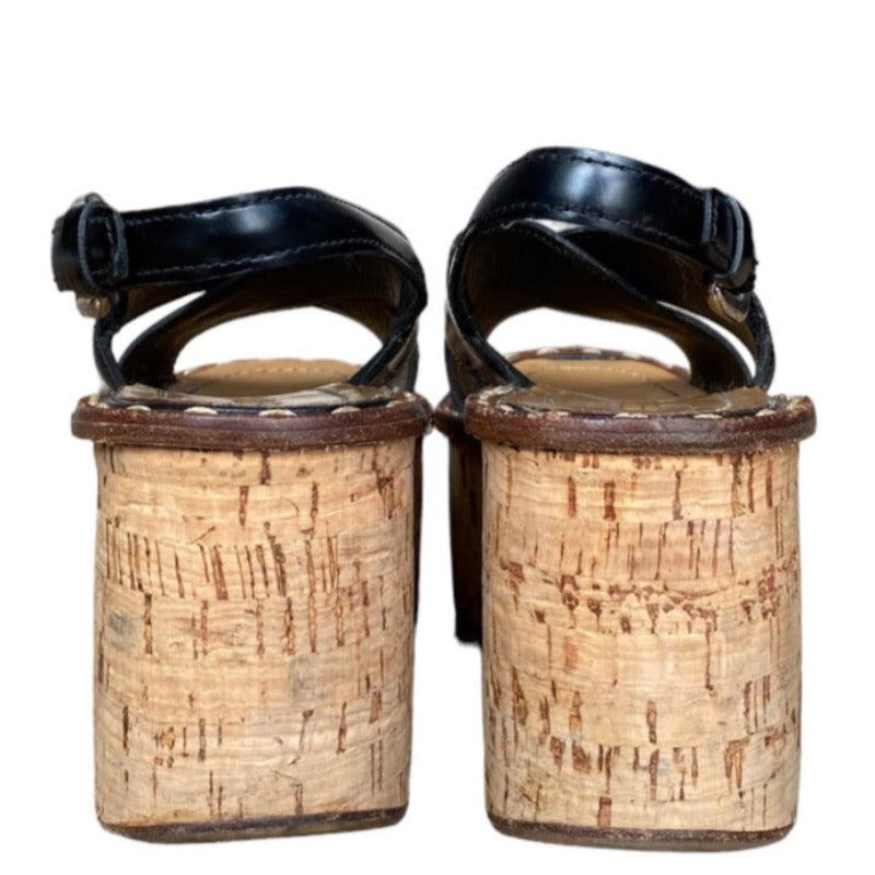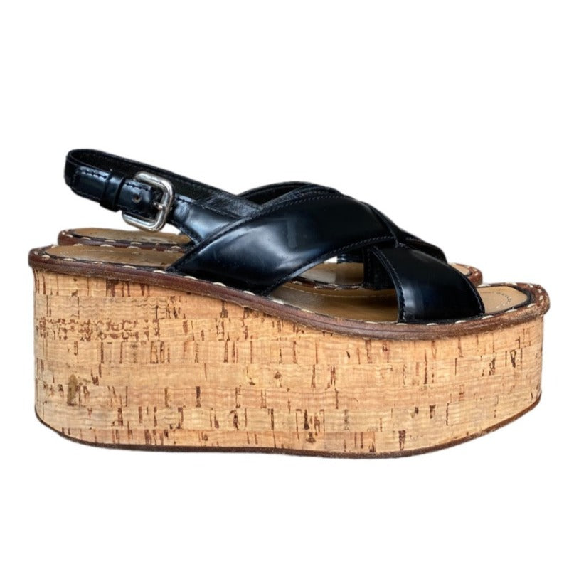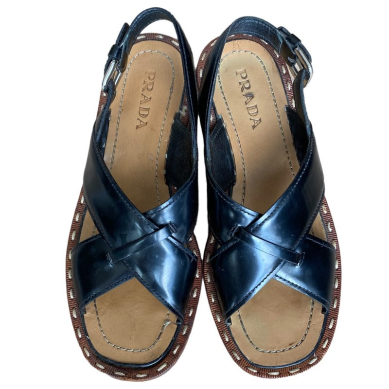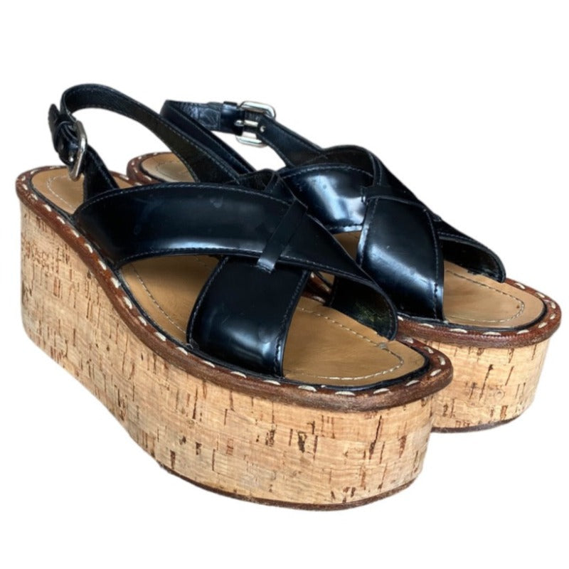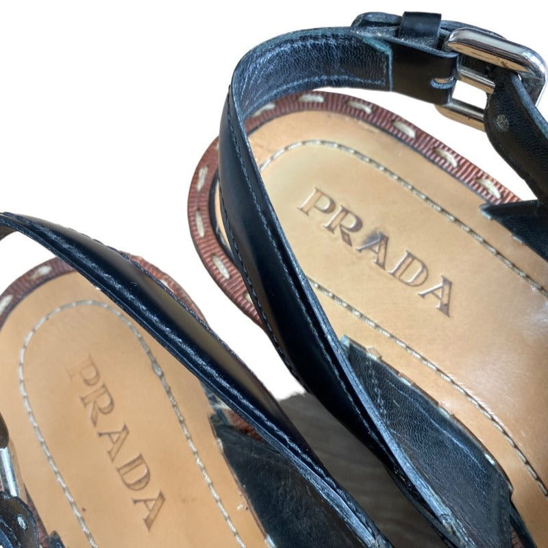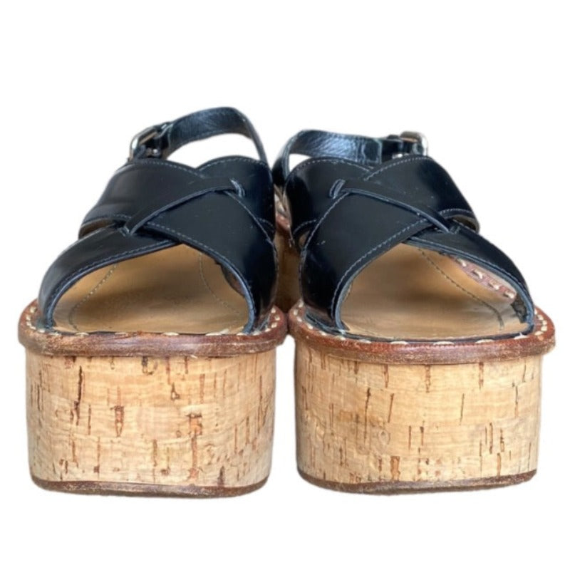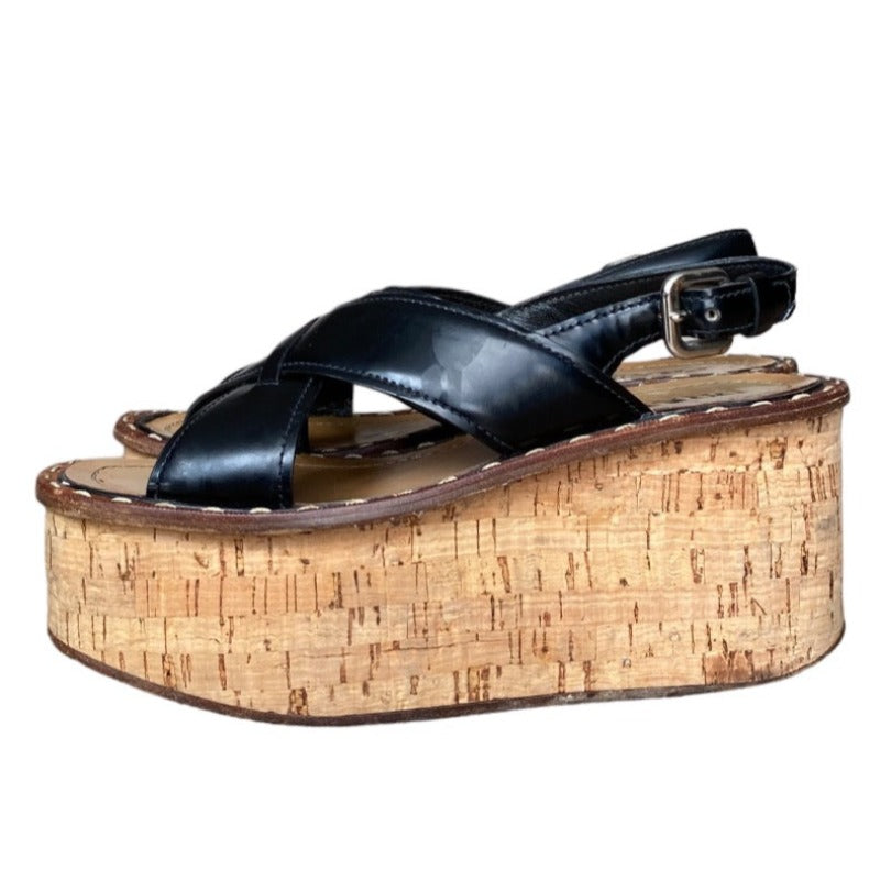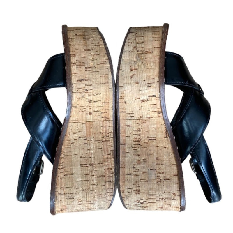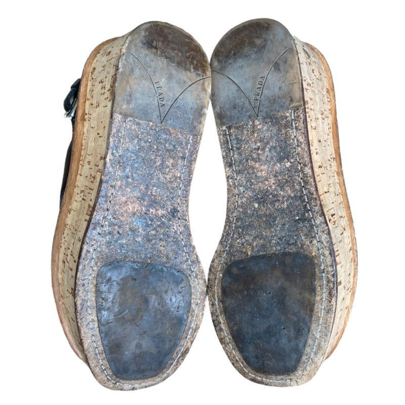 PRADA Black Crisscross Leather Slingback Flat Cork Wedge Sandals, Size 37