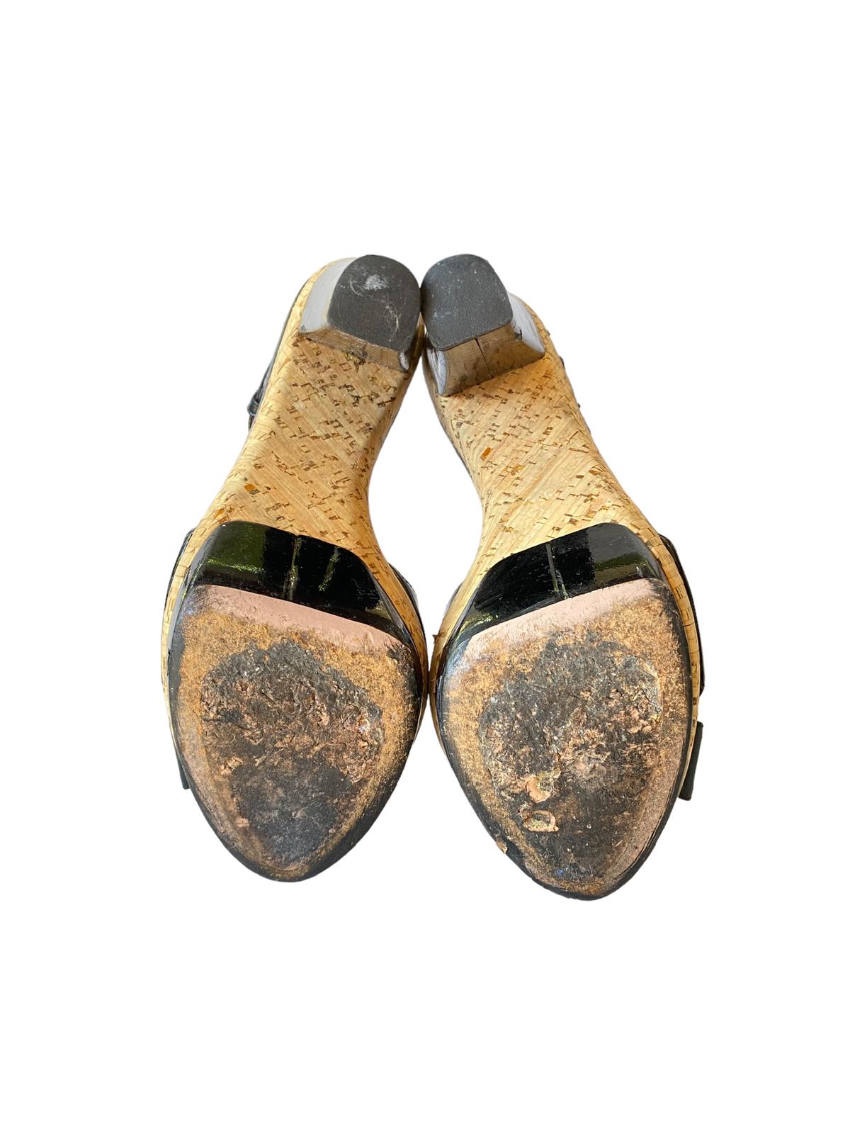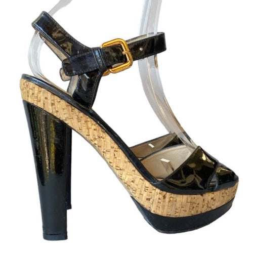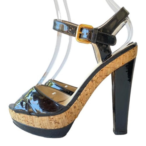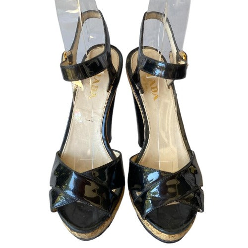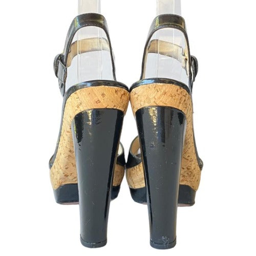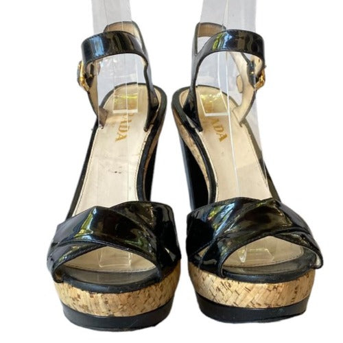 PRADA Black Patent Leather, Crisscross & Ankle Strap Cork Platform Sandals, 36.5