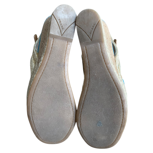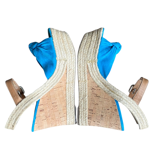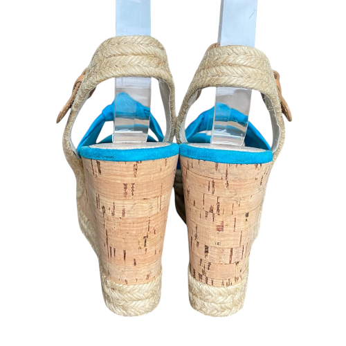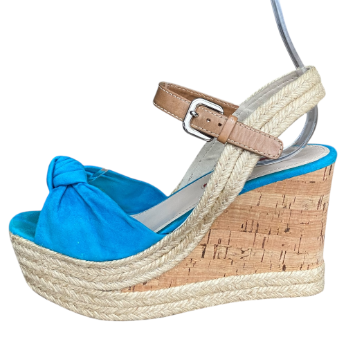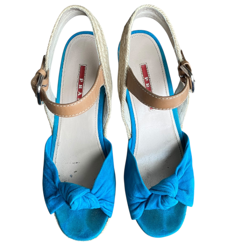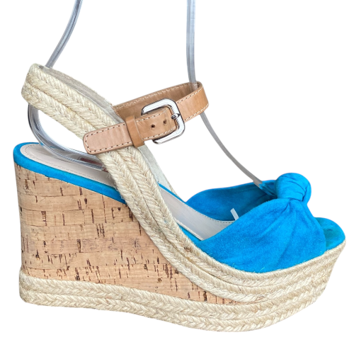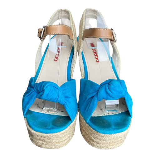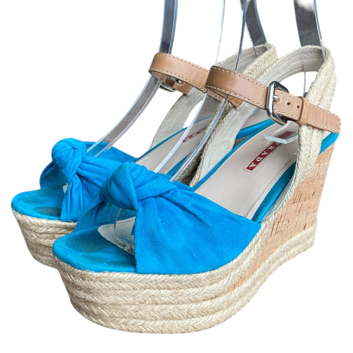 PRADA Blue Suede Espadrille Platform Cork Ankle Wrap Wedge Sandals, Size 37
