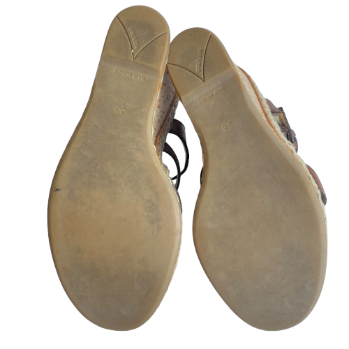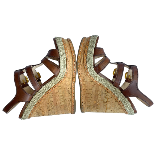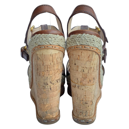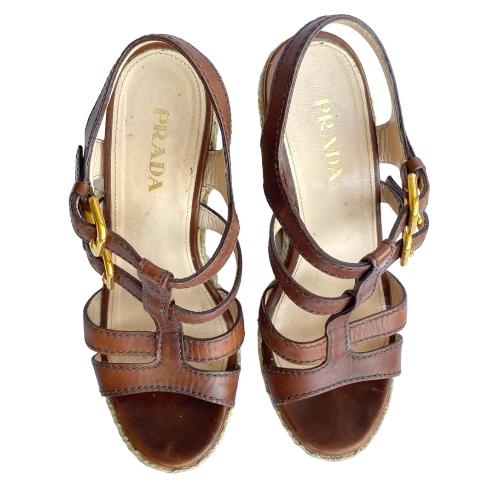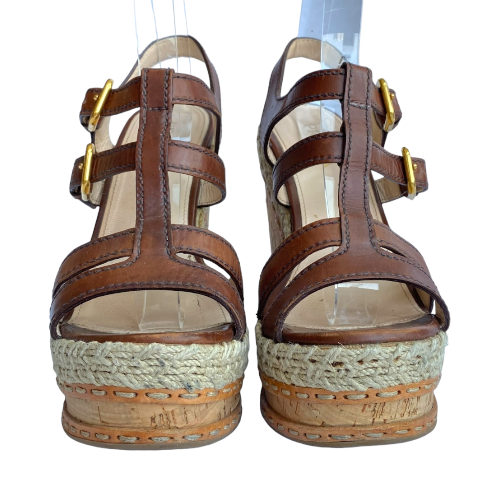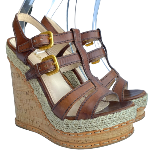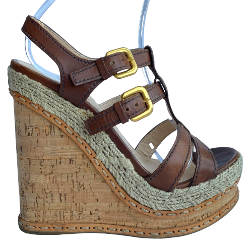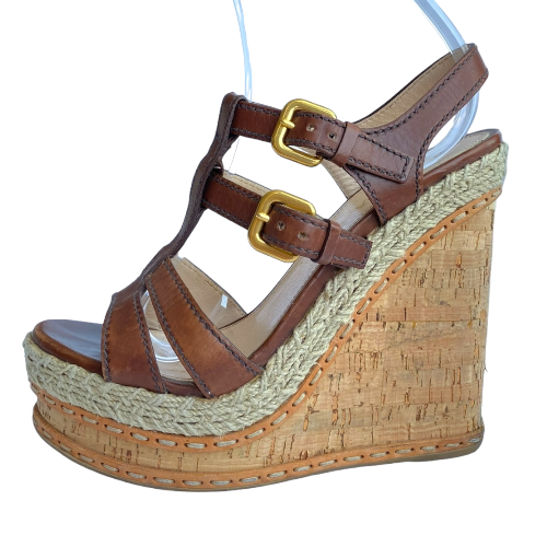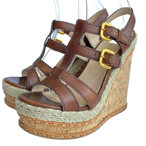 PRADA Brown Leather Strappy Cork Wedge Sandals, Size 38