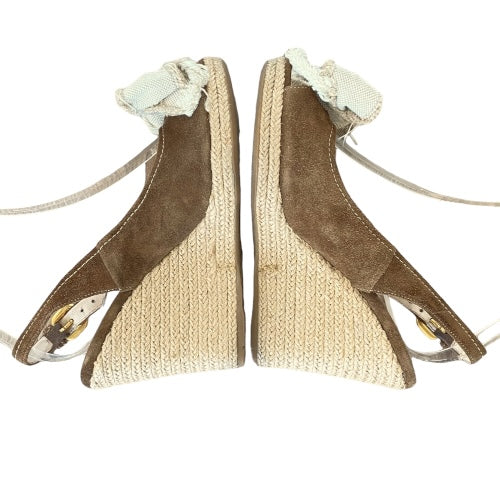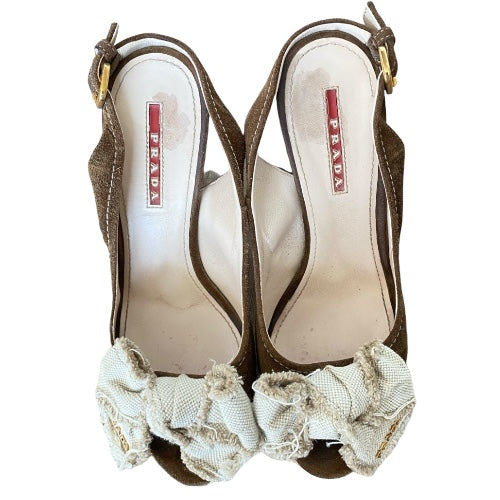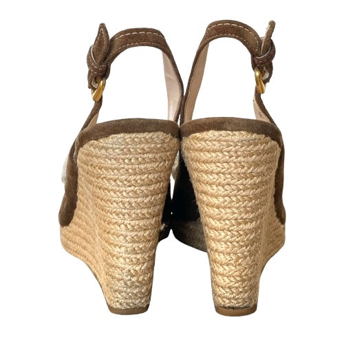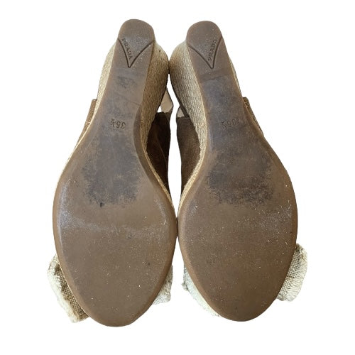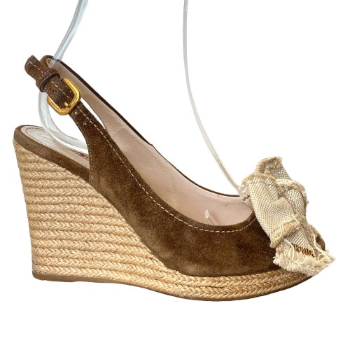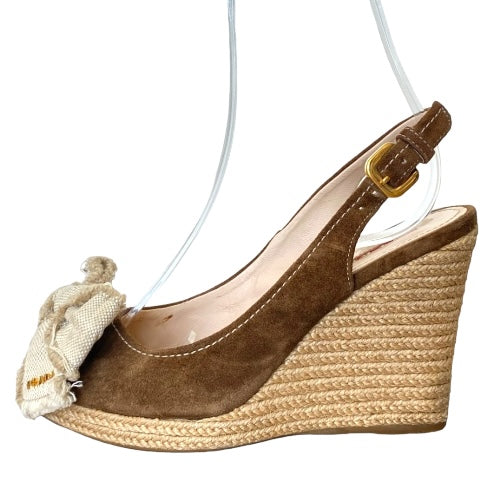 PRADA Brown Suede Bow Detail Slingback Espadrille Wedge Sandals, Size 35.5