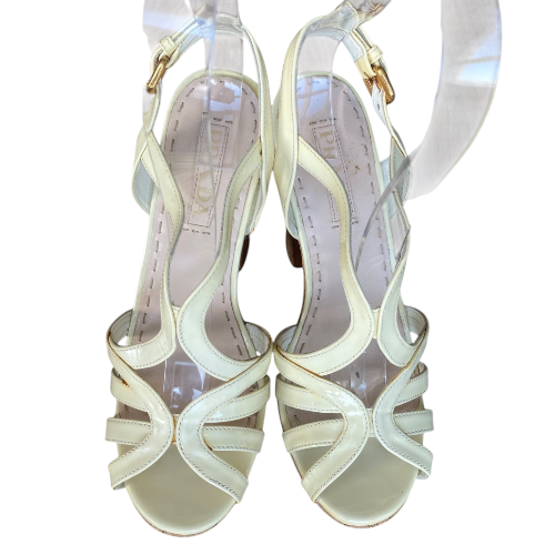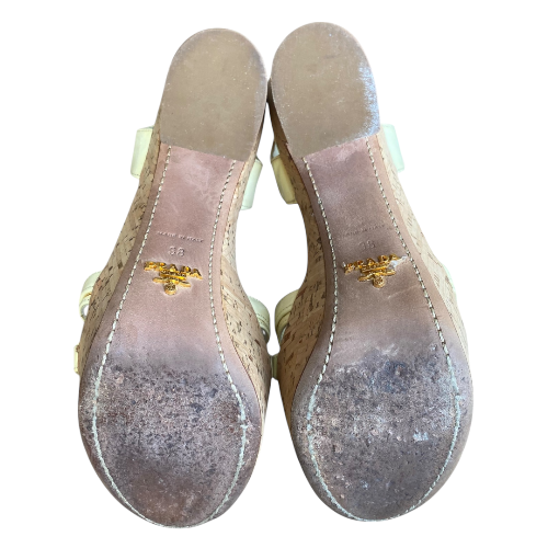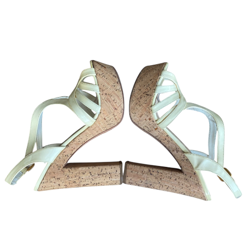 PRADA Cream Patent Leather Strappy Cork Heel Platform Sandals, Size 38