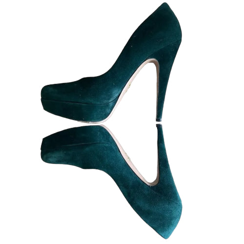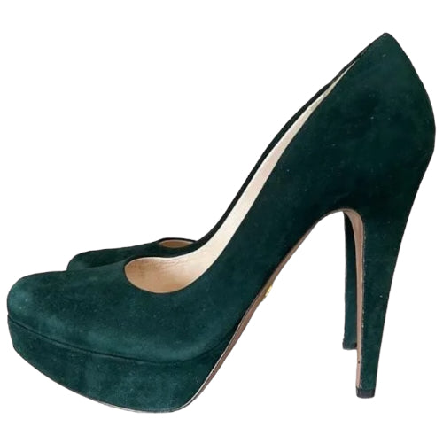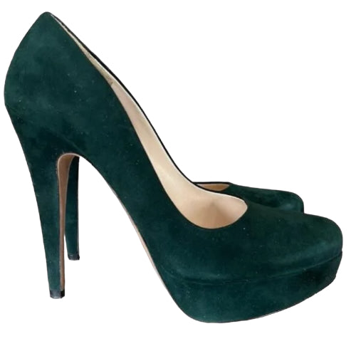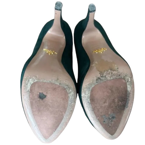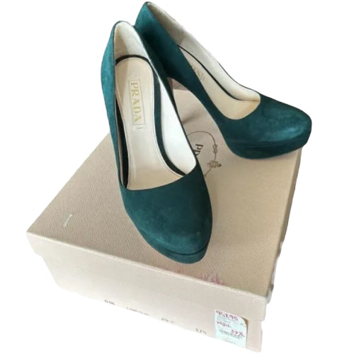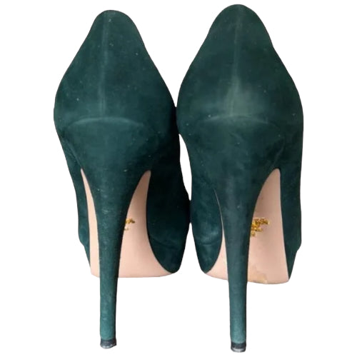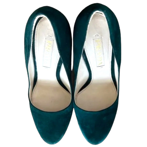 PRADA Dark Green Suede Almond Toe Platform Pumps, Size 37.5