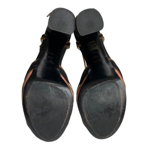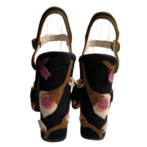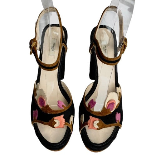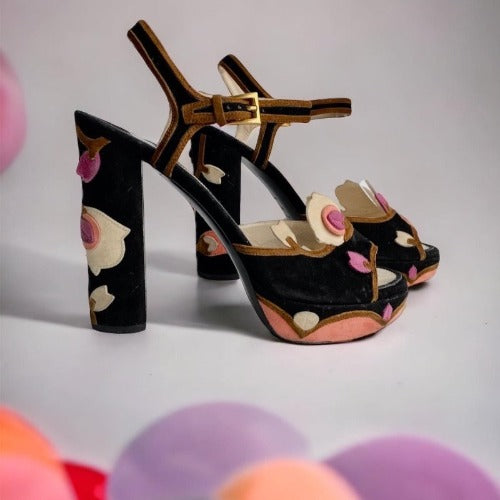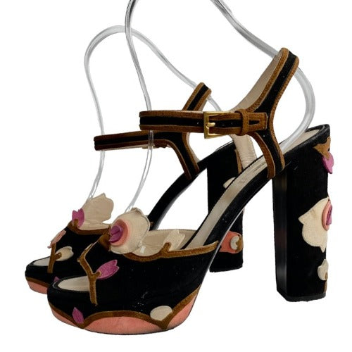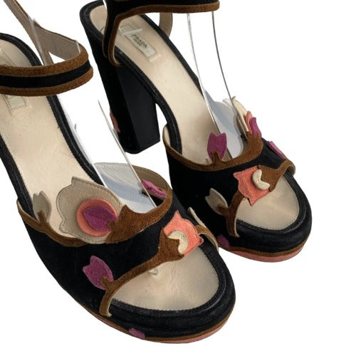 PRADA Floral Black Suede High Heel Platform Sandals, Size 40.5