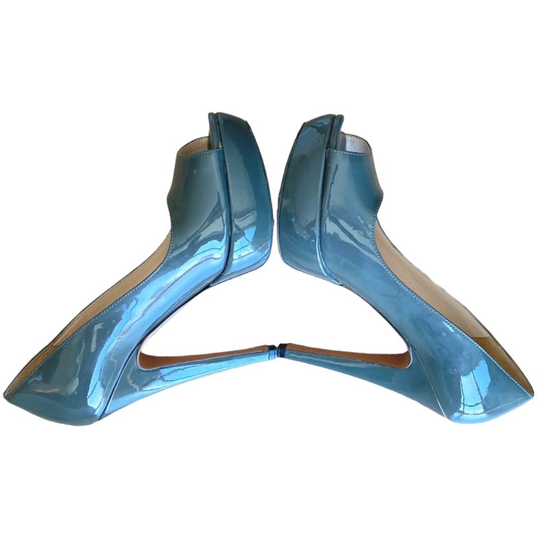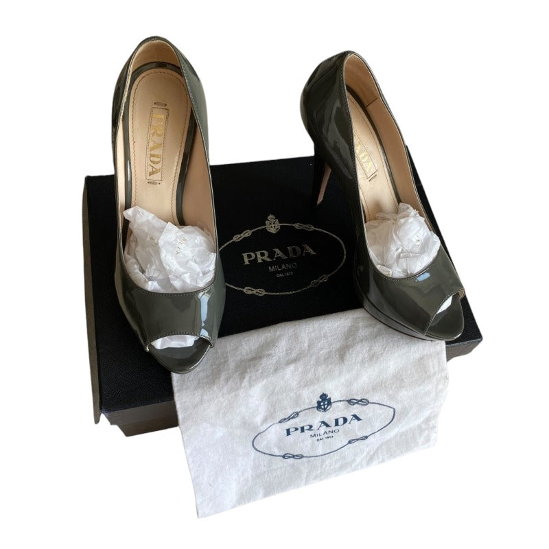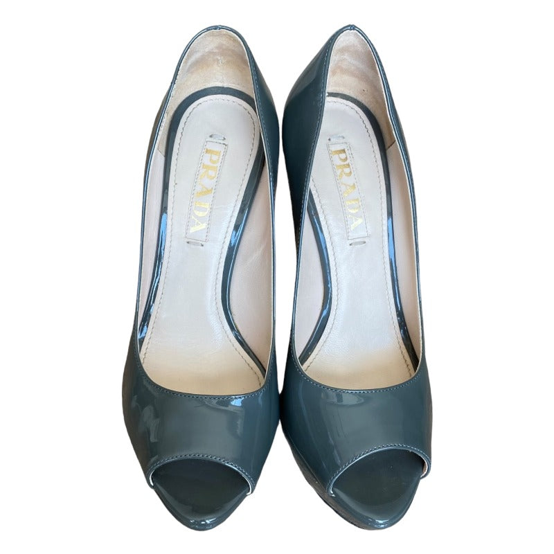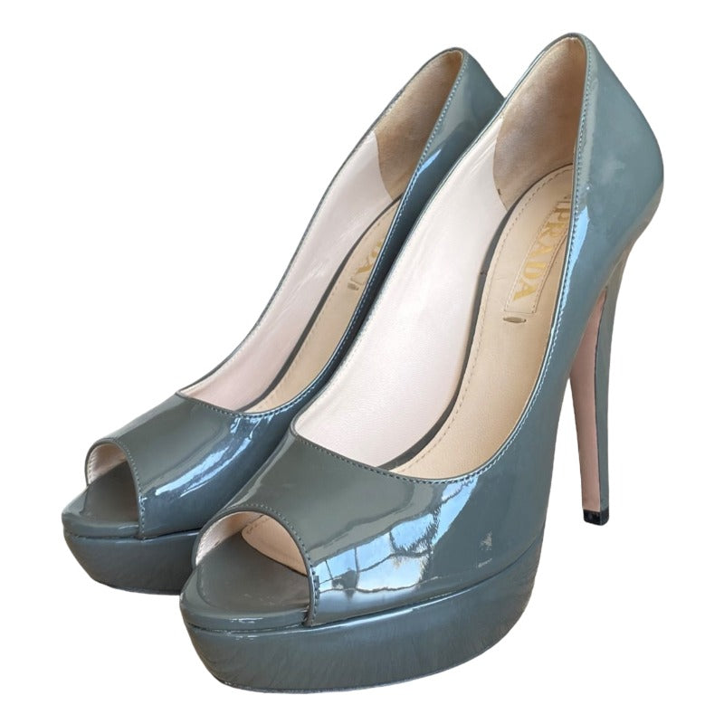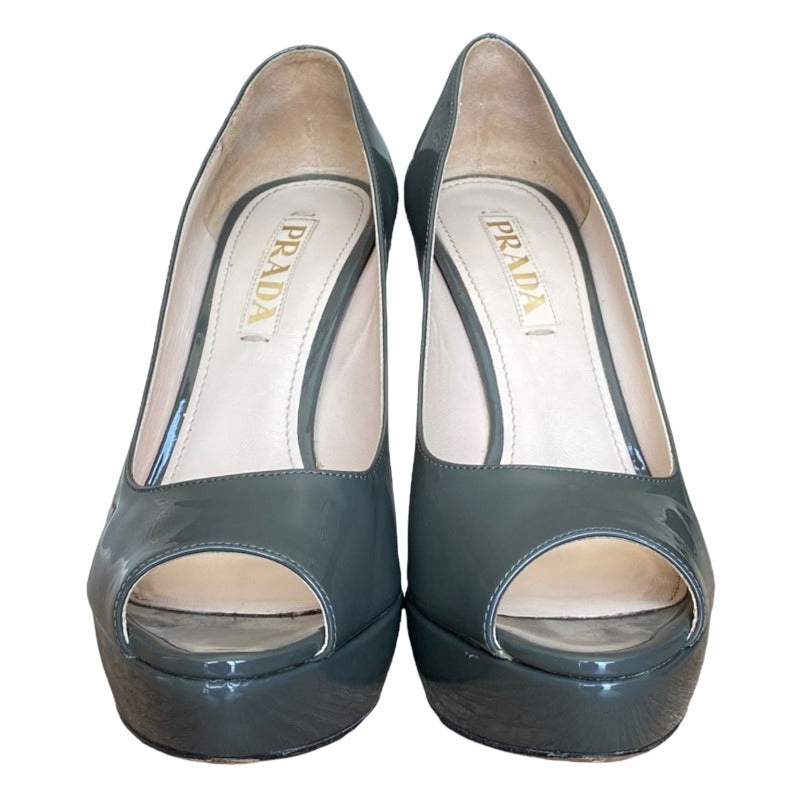 PRADA Gray Patent Leather Peep Toe Platform Pumps, Size 36