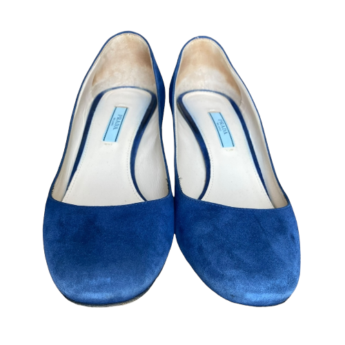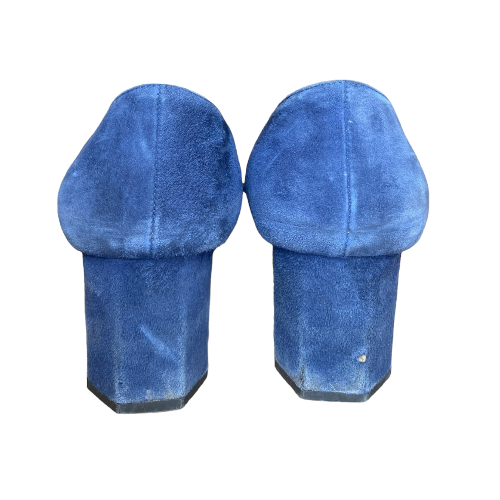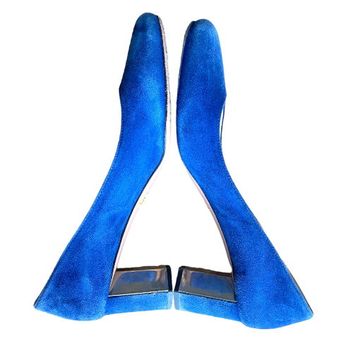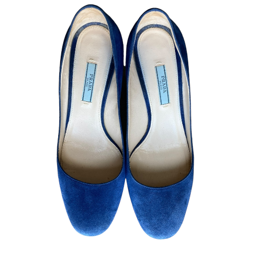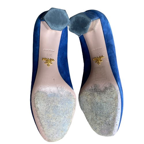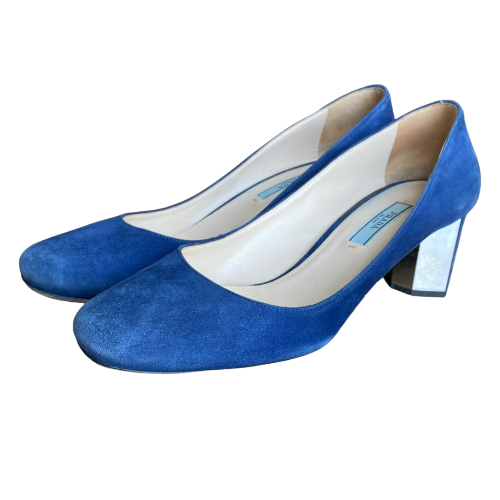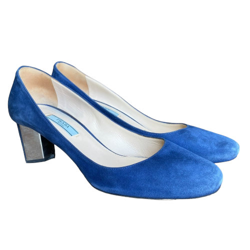 PRADA Navy Blue Suede Hexagon Heel Pumps, Size 38.5