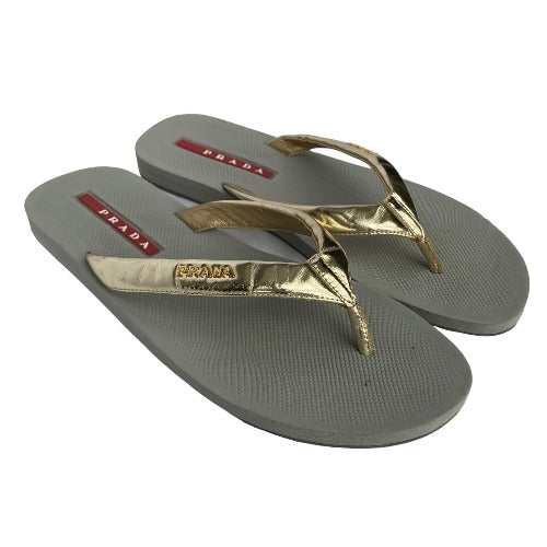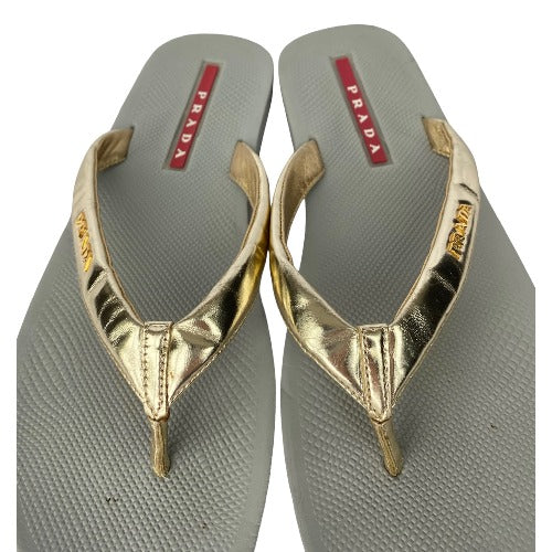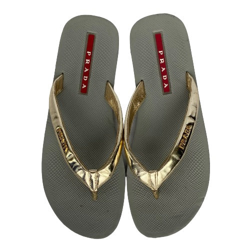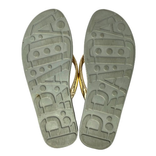 PRADA Sport Gold Patent Leather Prada Logo Flip Flop Rubber Sandals, Size 41