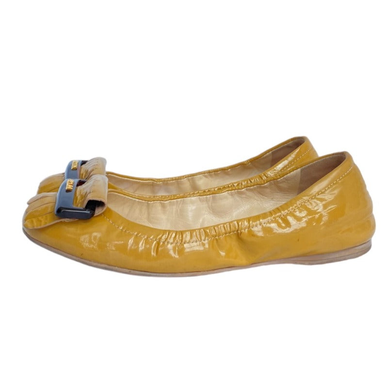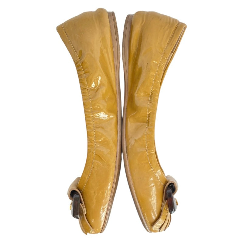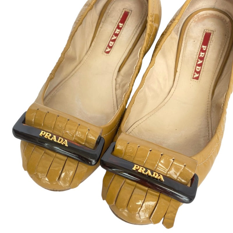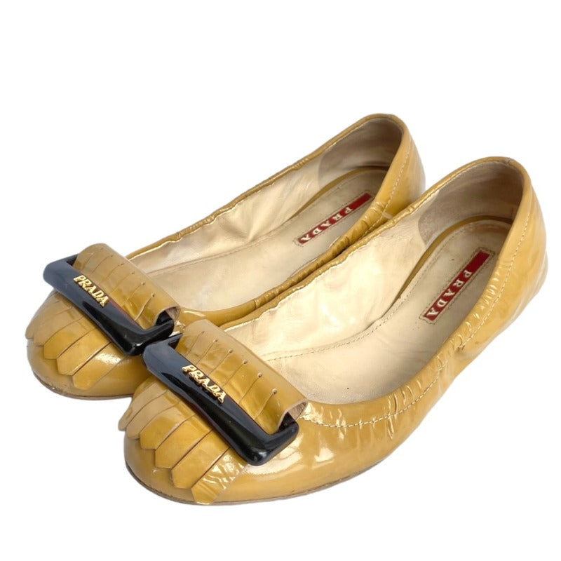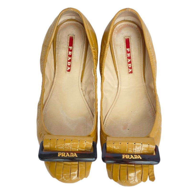 PRADA Yellow Patent Leather, Logo Buckle Fringe, Round Toe Ballet Flats, Size 36