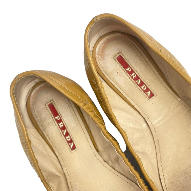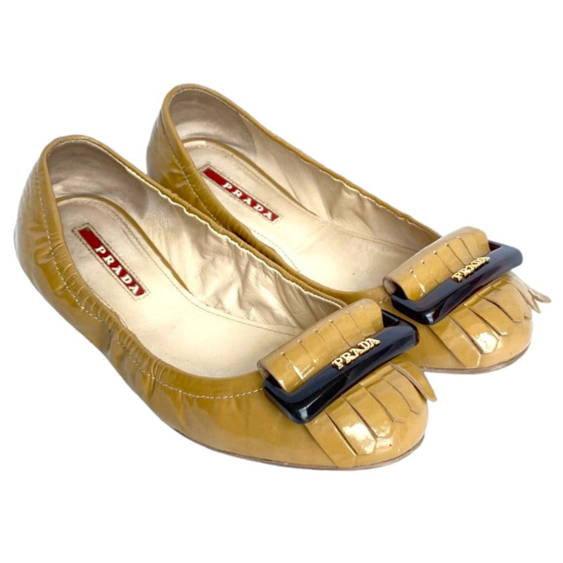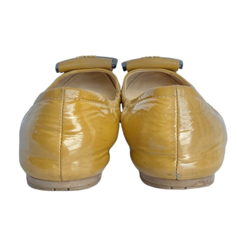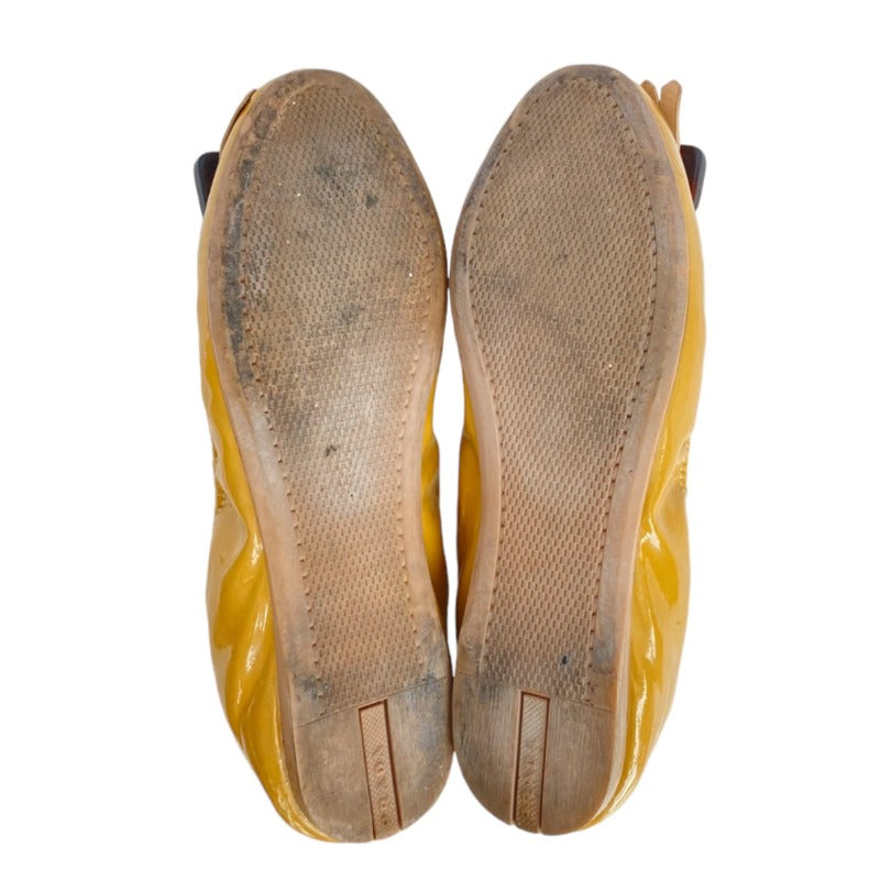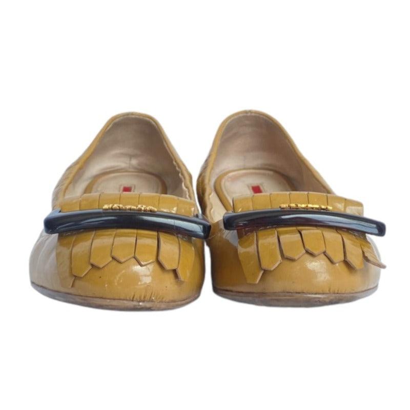 PRADA Yellow Patent Leather, Logo Buckle Fringe, Round Toe Ballet Flats, Size 36