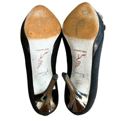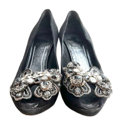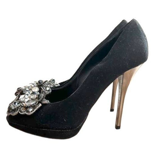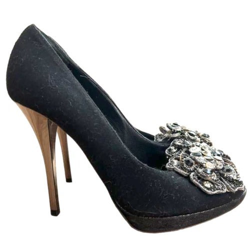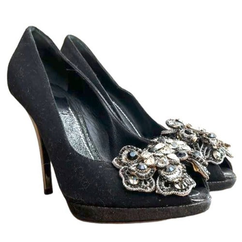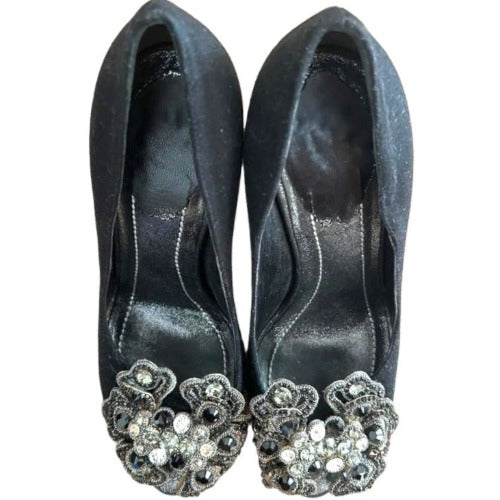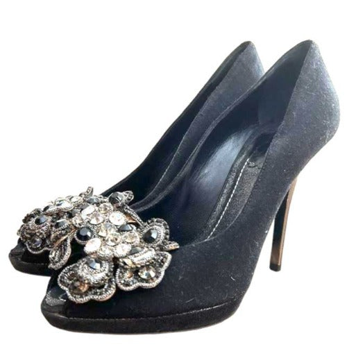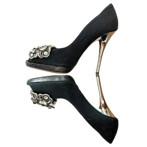 RENE CAOVILLA Black Fabric Silver Rhinestone Peep Toe Platform Pumps, Size 36.5