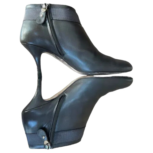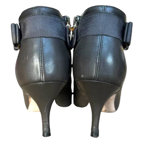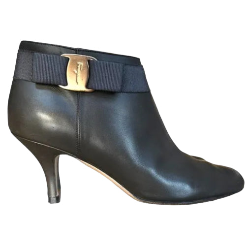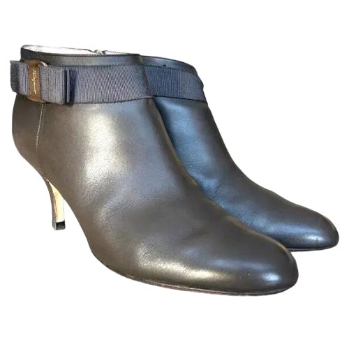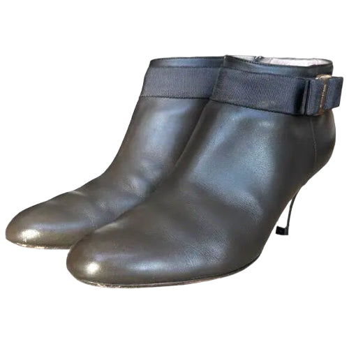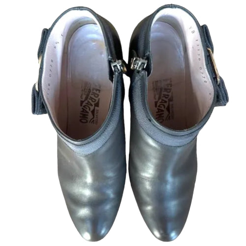 SALVATORE FERRAGAMO Anthracite Leather Bow Detail Ankle Booties, Size 6.5 C