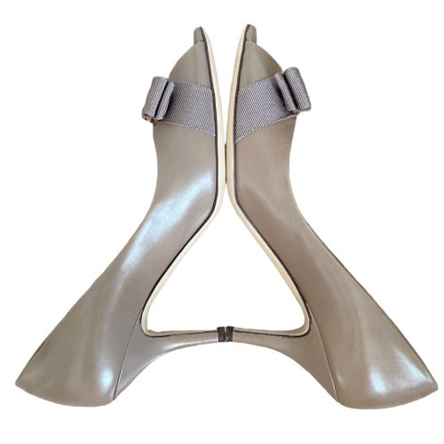 SALVATORE FERRAGAMO Taupe Leather Vara Bow Peep Toe Pumps, Size 37