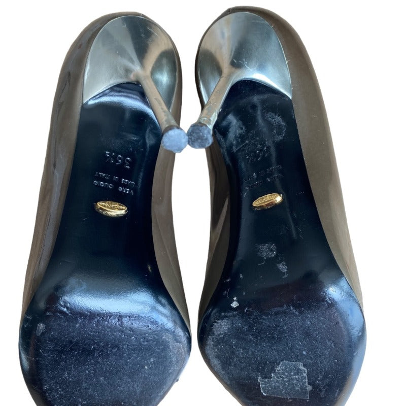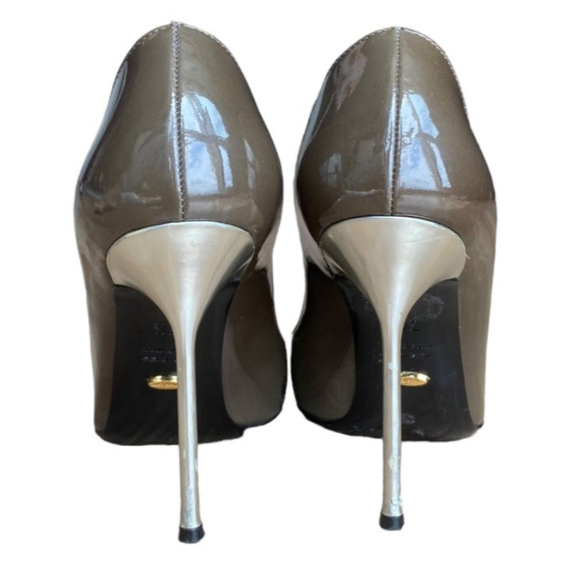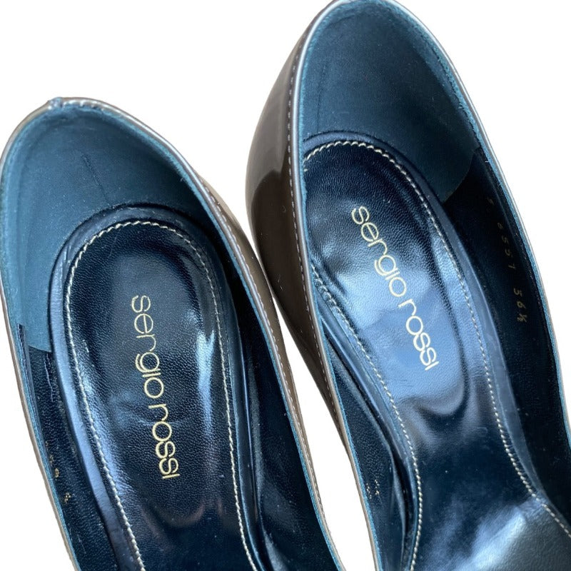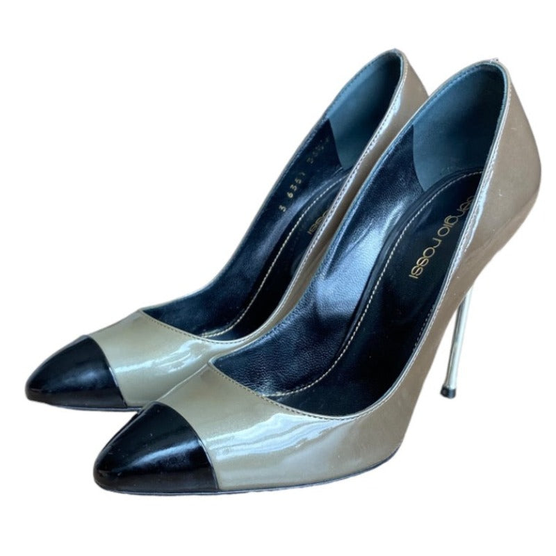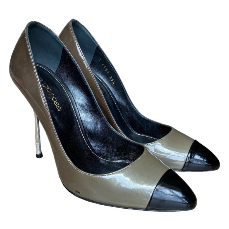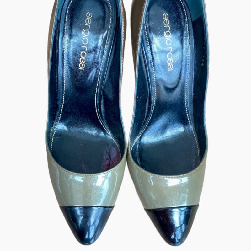 SERGIO ROSSI Gray Degrade Patent Leather Black Cap Toe Silver Heel Pumps, Size 36