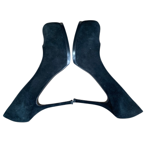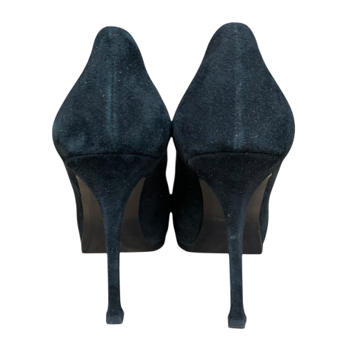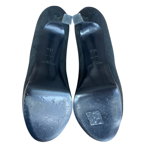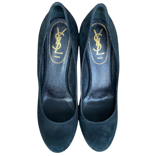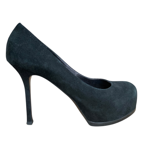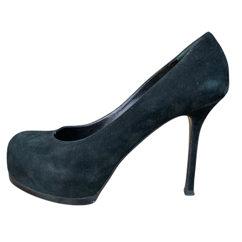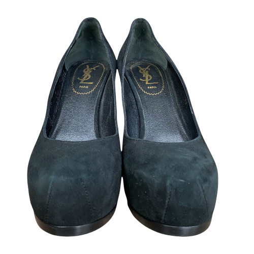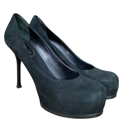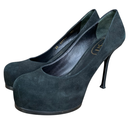 YSL YVES SAINT LAURENT Black Suede Tribtoo Tribute Platform Pumps, Size 38.5