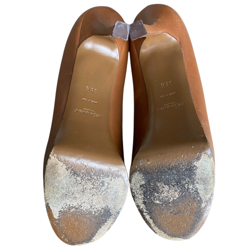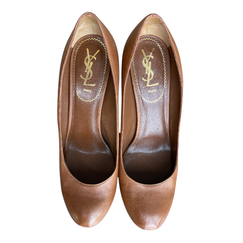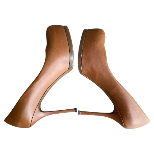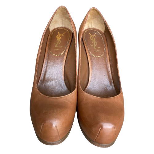 YSL YVES SAINT LAURENT Brown Leather Tribtoo Tribute Platform Pumps Size 38.5