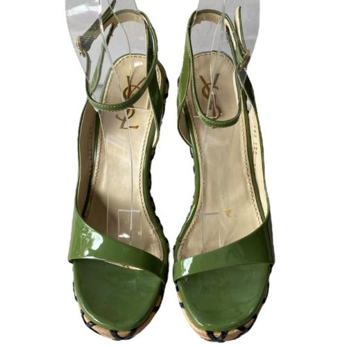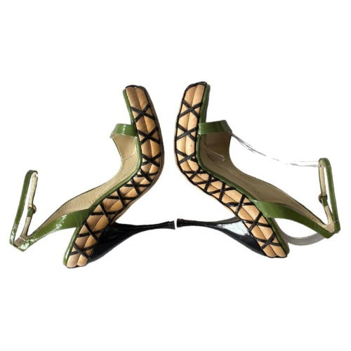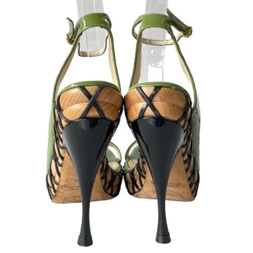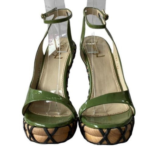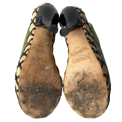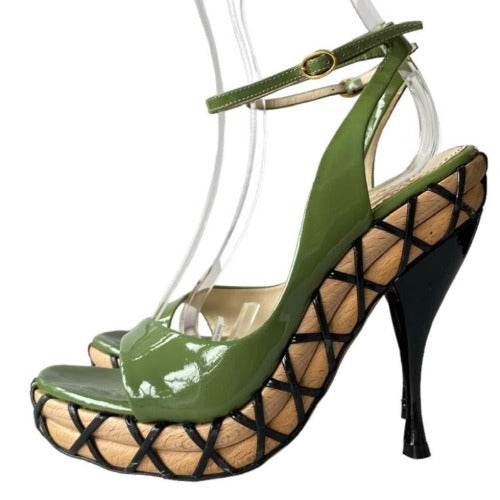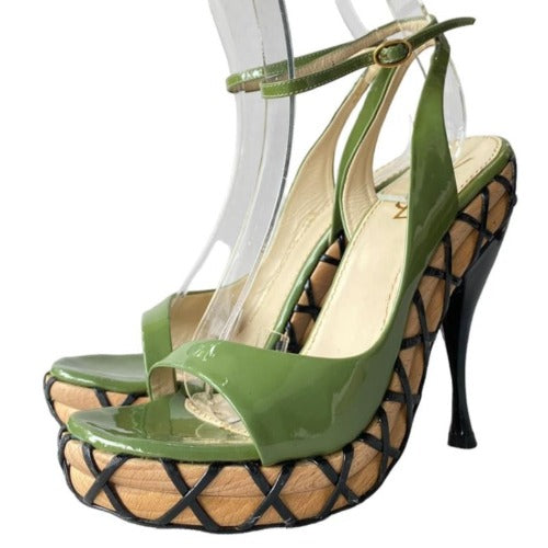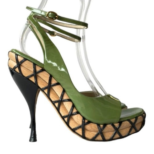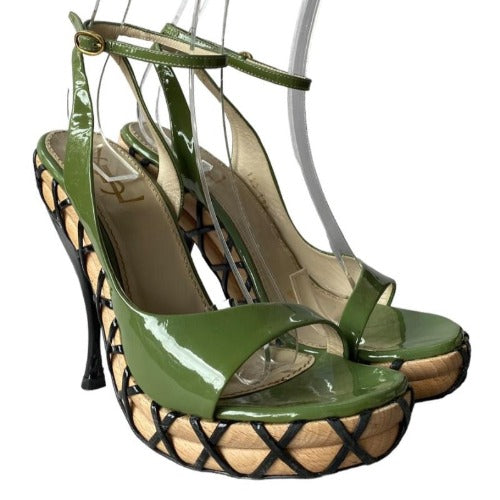 YVES SAINT LAURENT Green Patent Leather Wooden Sole Platform Sandals, Size 36.5