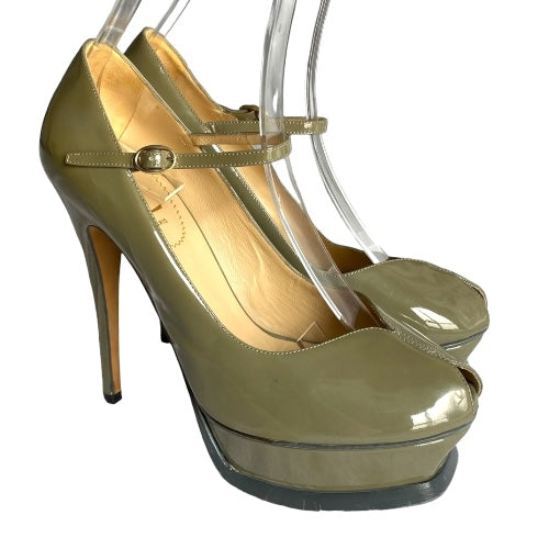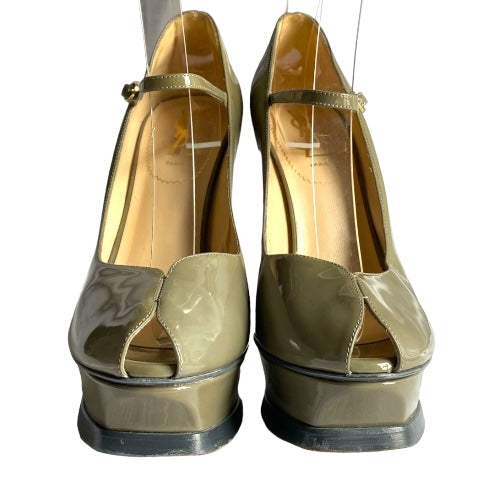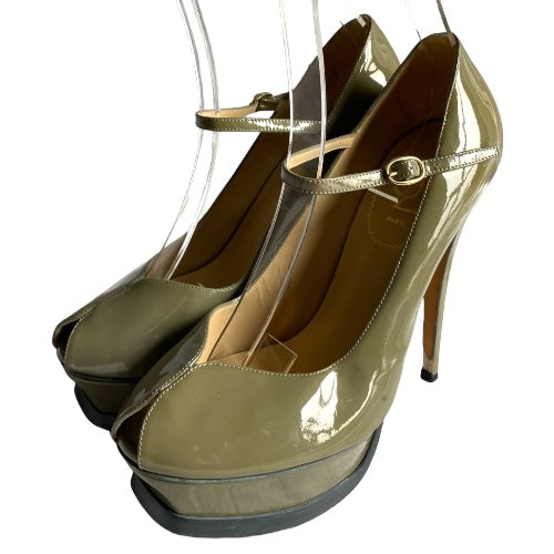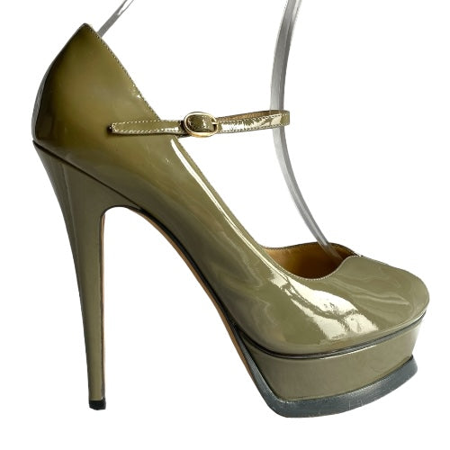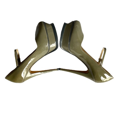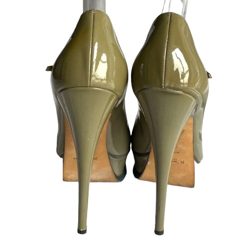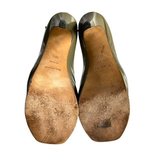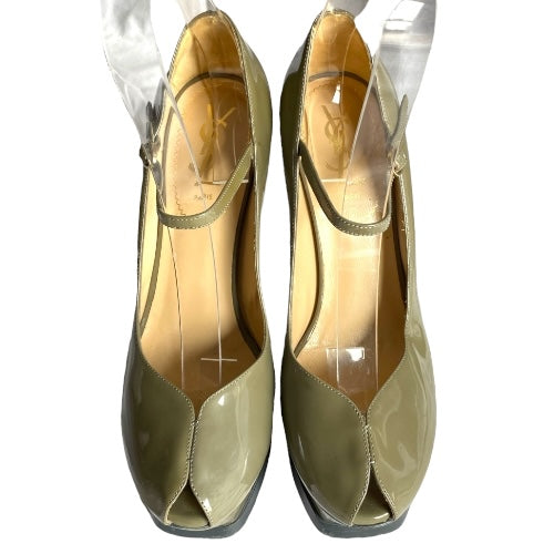 YVES SAINT LAURENT Olive Green Patent Leather Tribute Mary Jane Pumps, Size 38.5