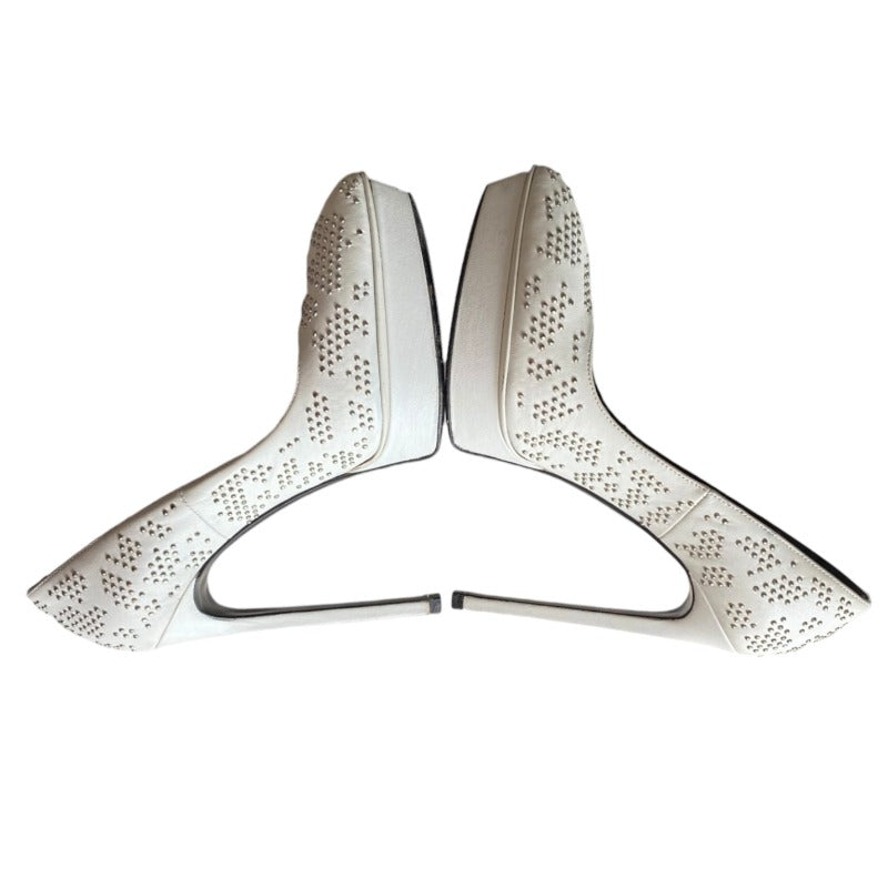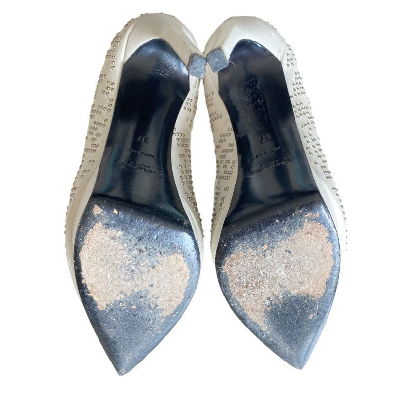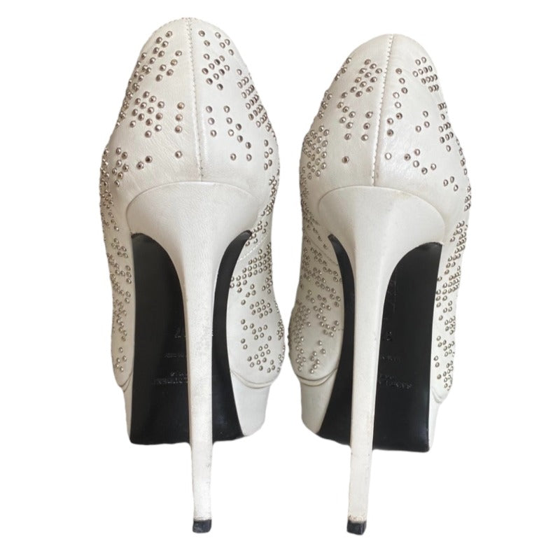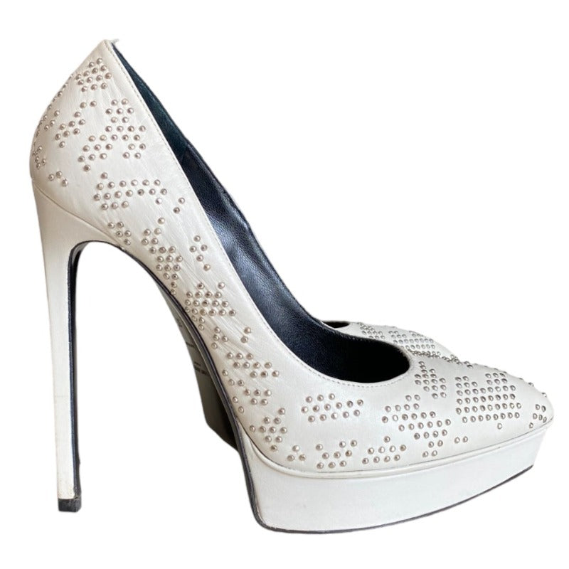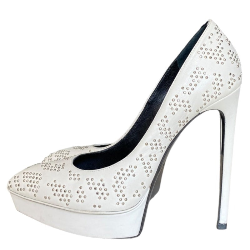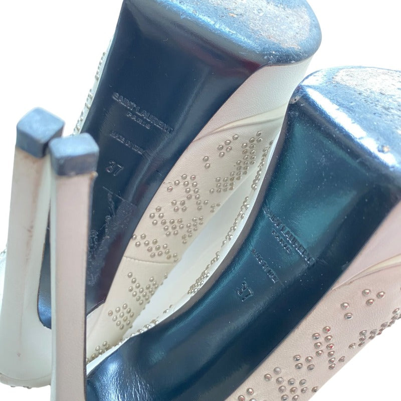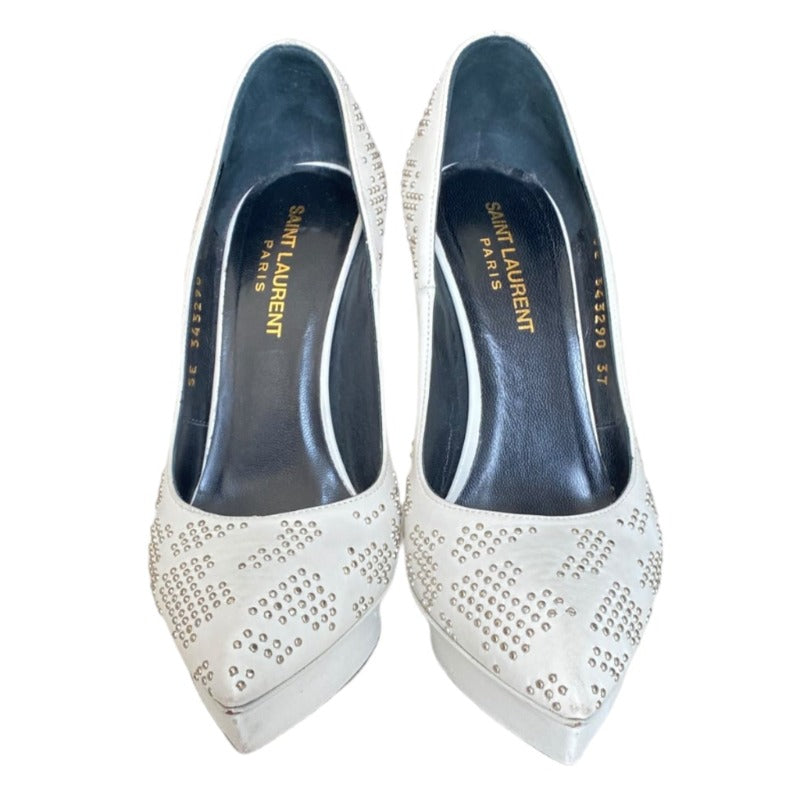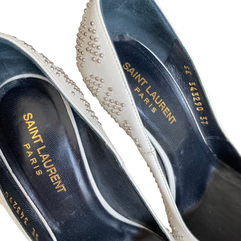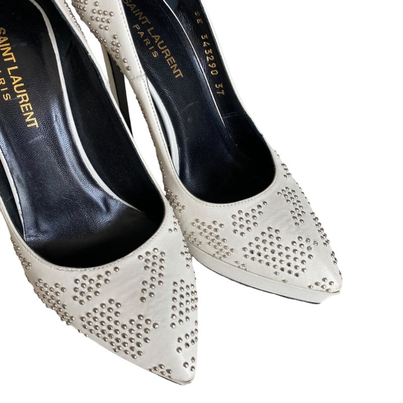 YSL YVES SAINT LAURENT White Leather Studded Janis Platform Pointed Toe Pumps, 37